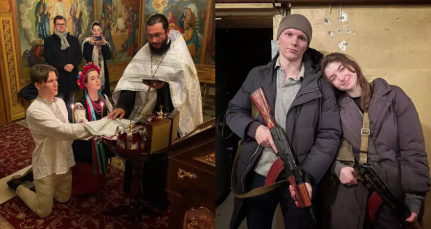 Yaryna Arieva, 21, iyo Sviatoslav Fursin, 24, oo ku ballamay inay aqal galaan Bisha May ee sanadkan ayaa guurkooda soo dedejiyay markii Ruushku soo fara geliyay dalkooda.